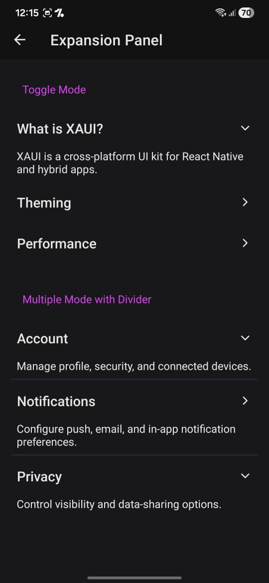 import { ExpansionPanel, ExpansionPanelItem } from '@xaui/native/expansion-panel'export function MyComponent() {return (<ExpansionPanel variant="light" showDivider><ExpansionPanelItem title="Section 1"><Text>Content for section 1</Text></ExpansionPanelItem><ExpansionPanelItem title="Section 2"><Text>Content for section 2</Text></ExpansionPanelItem></ExpansionPanel>)}